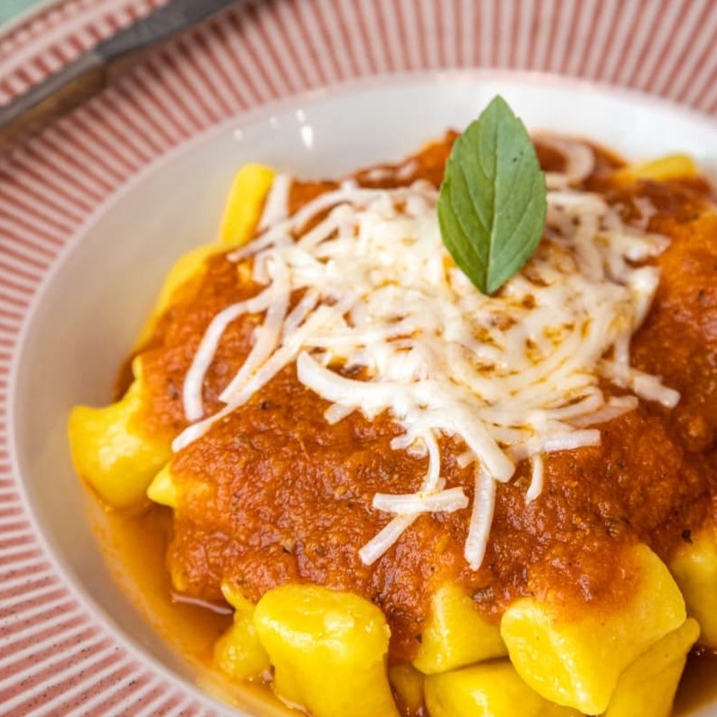 Massa de nhoque de batata, molho ao sugo artesanal, finalizado com queijo parmesão ralado. Serve 1 pessoa. Embalagem para forno 25 minutos, 180 Pode retirar da embalagem e aquecer em micro.