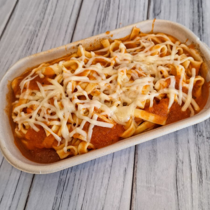 Massa artesanal de rondelli, enrolada e recheada com molho ao sugo. Finalizada com queijo parmesão ralado. Embalagem para forno 25 minutos, 180 Pode tirar da embalagem e aquecer em micro ondas. 3 fatias de rondelli, aproximadamente 450/500g Serve 1 pessoa.
