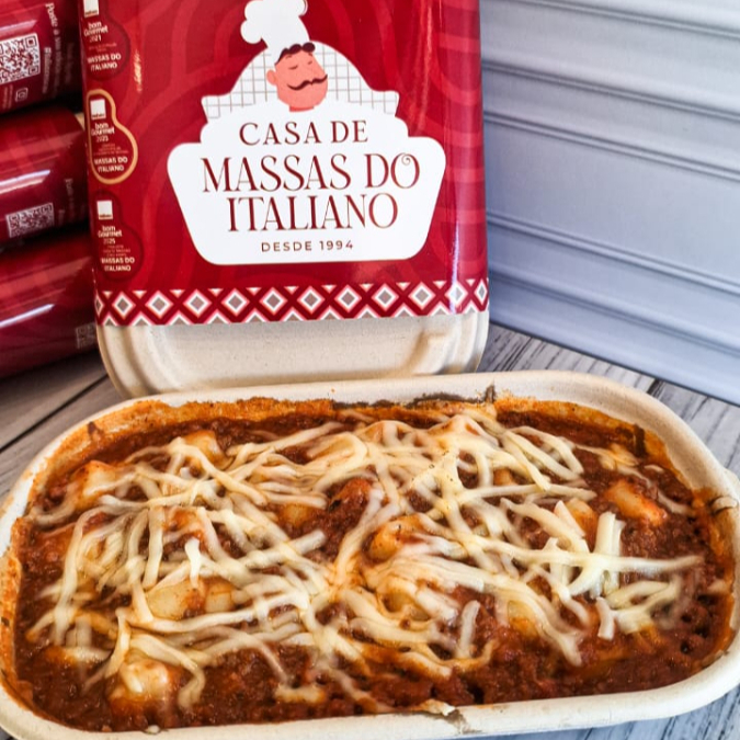 Massa de nhoque de batata, molho artesanal de tomate, carne moída, finalizado com parmesão ralado. Embalagem para forno 25 minutos, 180 Pode tirar da embalagem e aquecer em micro. Serve 3 à 4 pessoas.