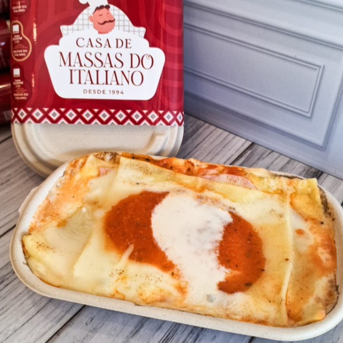 Massa artesanal, camadas de molho de tomate artesanal, molho branco, fatias de presunto e queijo mussarela, finalizado com queijo parmesão ralado. Embalagem para forno, 25minutos - 180. Pode tirar da embalagem e aquecer em micro ondas. Serve 1 pessoas.