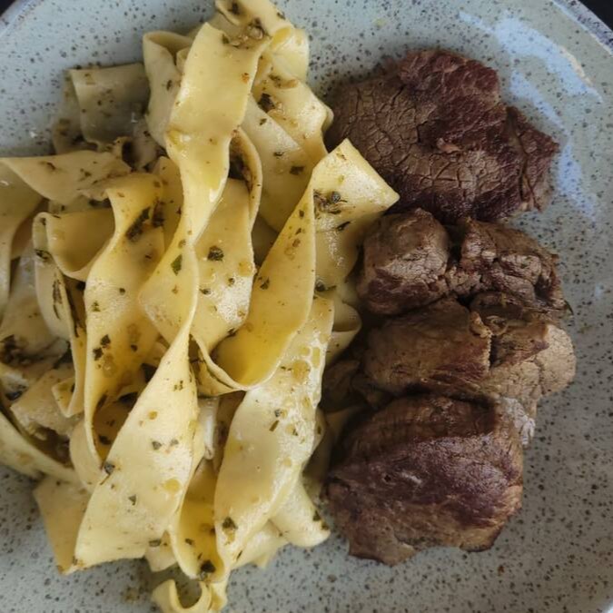 Mignon grelhado e papardelle ao pesto, apróx. 300 gr carne,