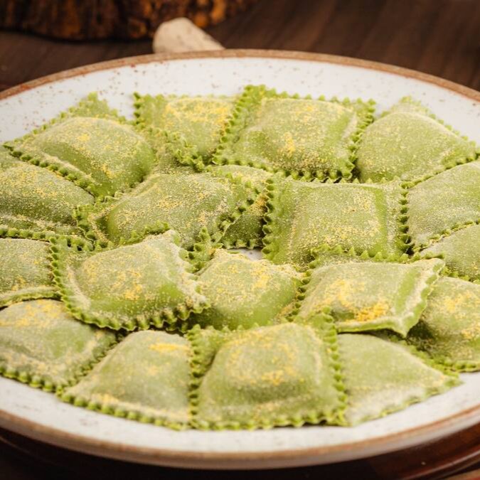 Massa de espinafre recheada com mussarela e tomate seco ao molho sugo com ervas finas. Queijo parmesão ralado por cima.