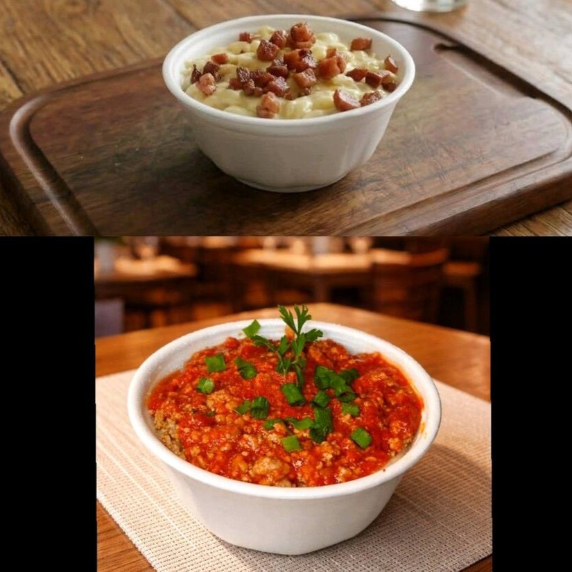 Um delicioso macarrão parafuso com requeijão cremoso caprichado com queijo mussarela finalizado com bacon em cubo