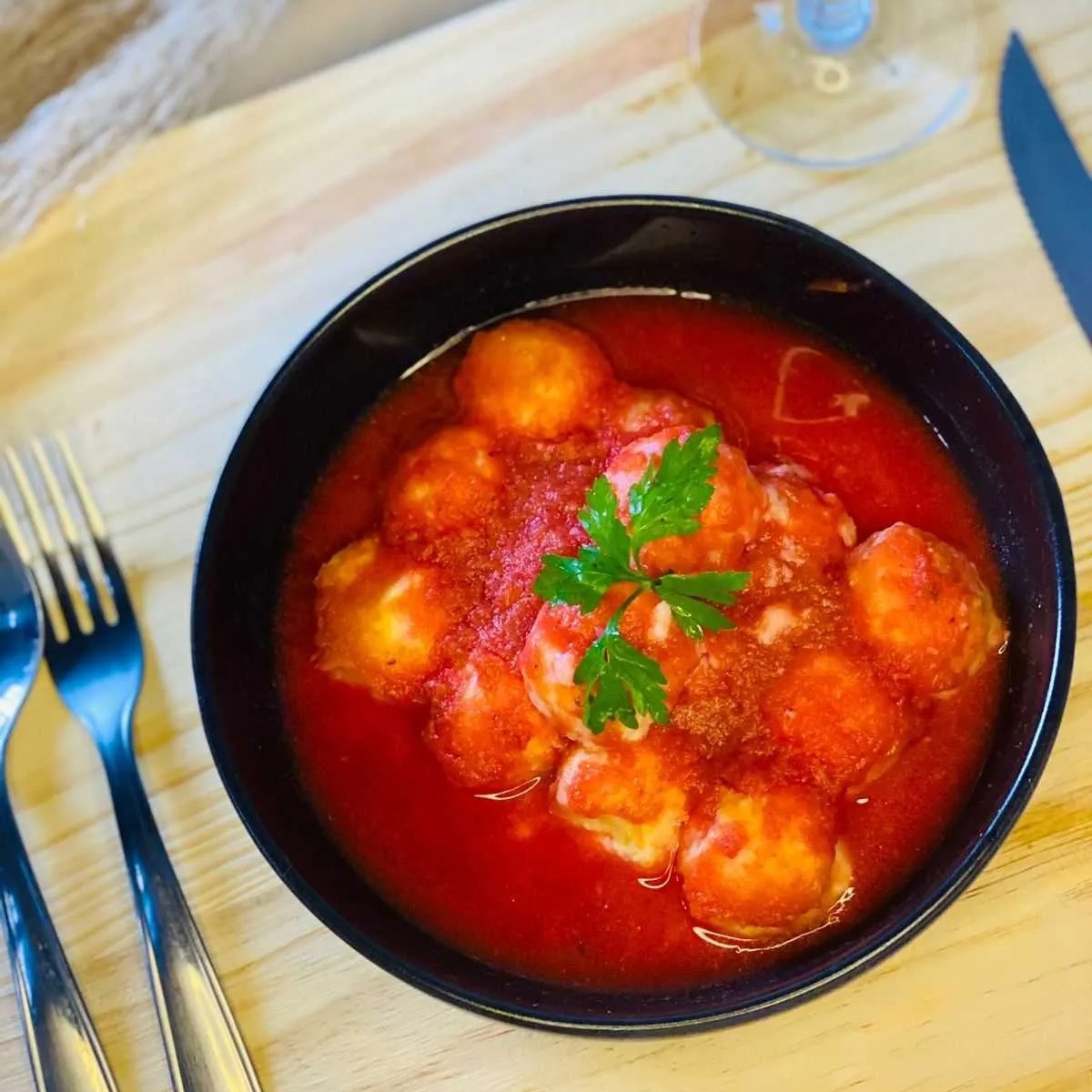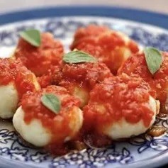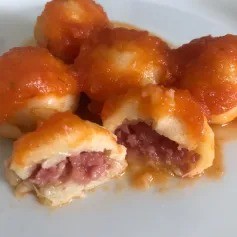 Nhoque caseiro recheado com presunto e queijo derretido. Acompanha molho sugo.
