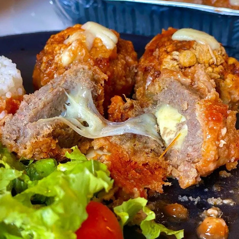 Polpetone suculento recheado com mussarela e queijo parmesão.