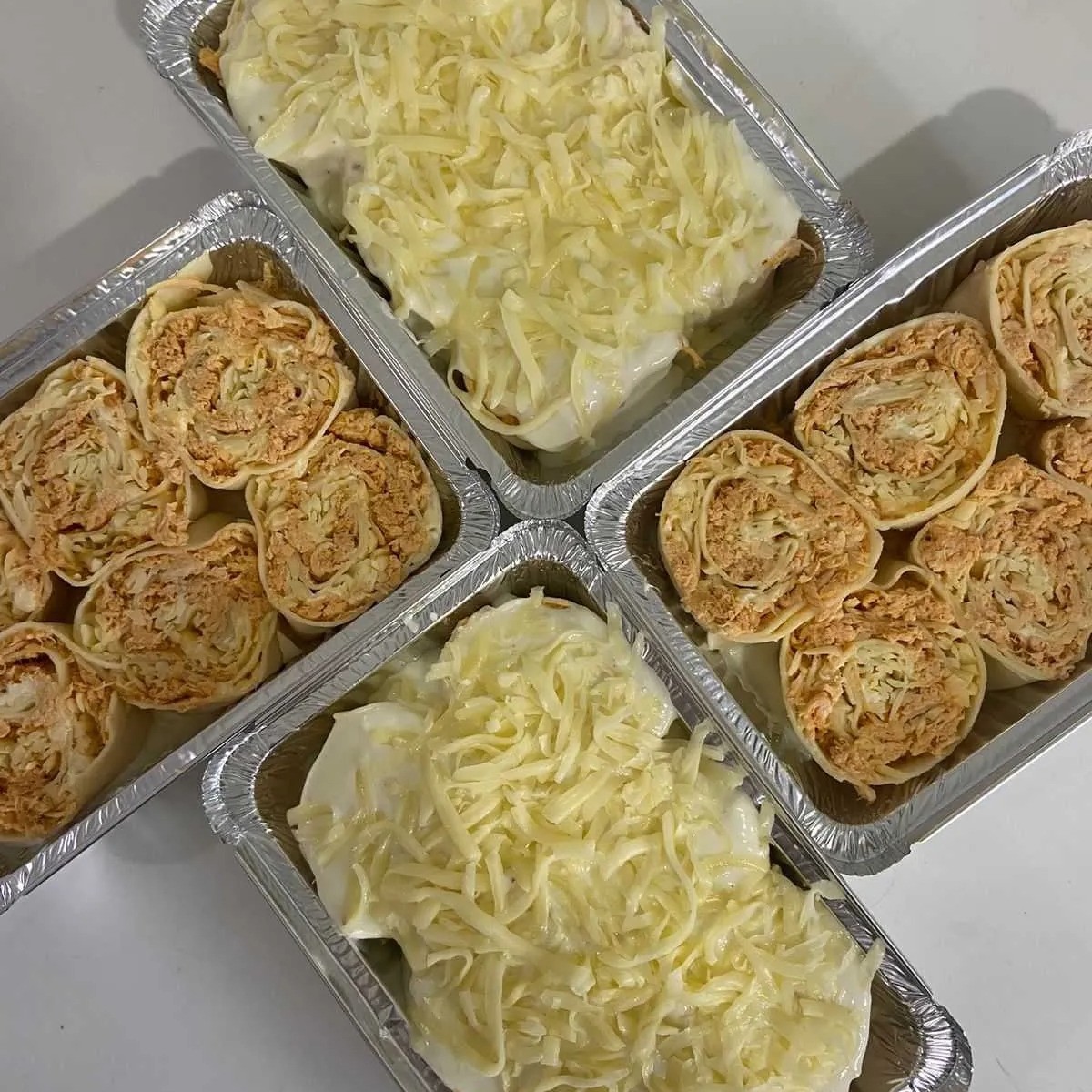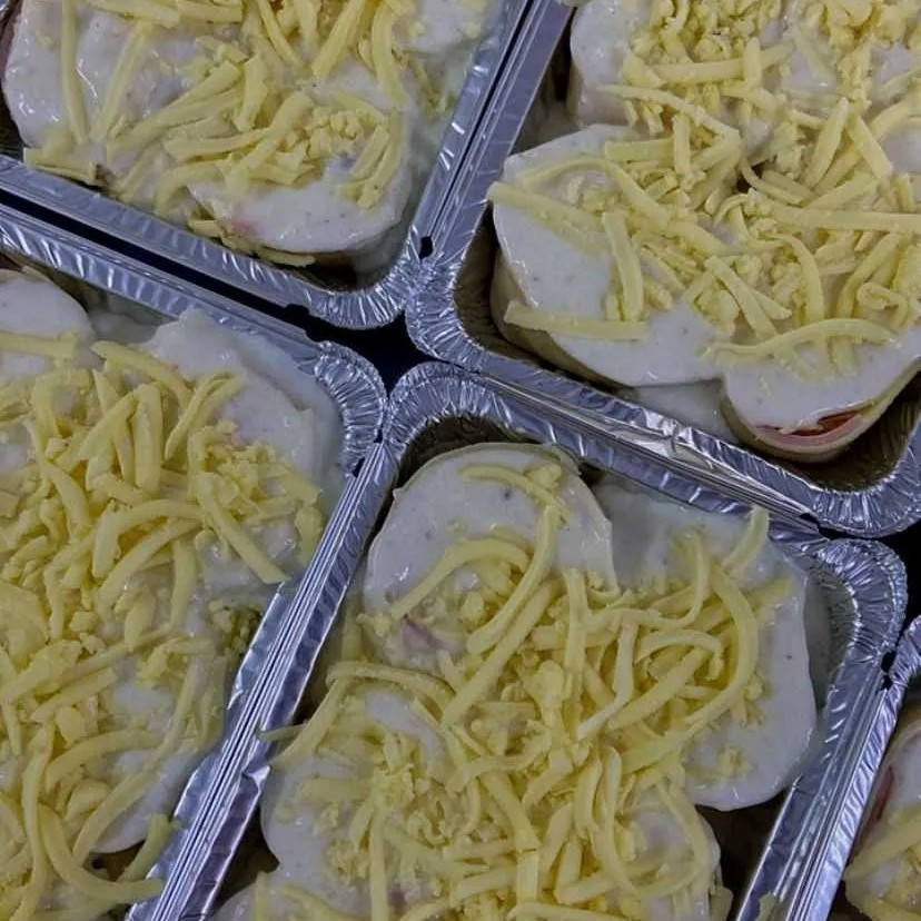 Camadas de frango temperado, molho branco e queijo mussarela.