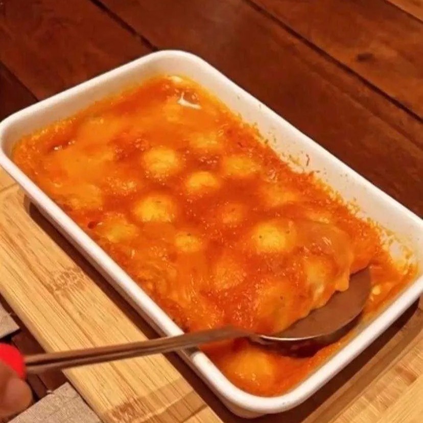 Nhoque caseiro recheado com calabresa e queijo derretido. Acompanha molho sugo.