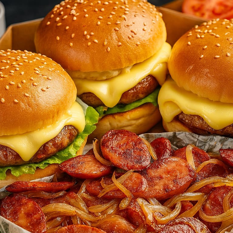 Combo Quinteto Bacon: Este combo inclui: 3 hambúrgueres saborosos com bacon crocante Pão com gergelim selado na manteiga, hamburguer tradicional de 56 gramas, Bacon crocante,queijo Mussarela, maionese artesanal, alface e tomate. Porção generosa de batatas fritas crocantes Anéis de cebola douradas Nuggets de frango premium Batatas rústicas Aproveite esta explosão de sabores em cada mordida! Os molhos da imagem são ilustrativo, voce pode adicinar nos comprementos de cada prato. Por favor, note que a imagem apresentada é meramente ilustrativa. Todos os combos estão sujeitos a variações na cor, organização e quantidade dos itens.