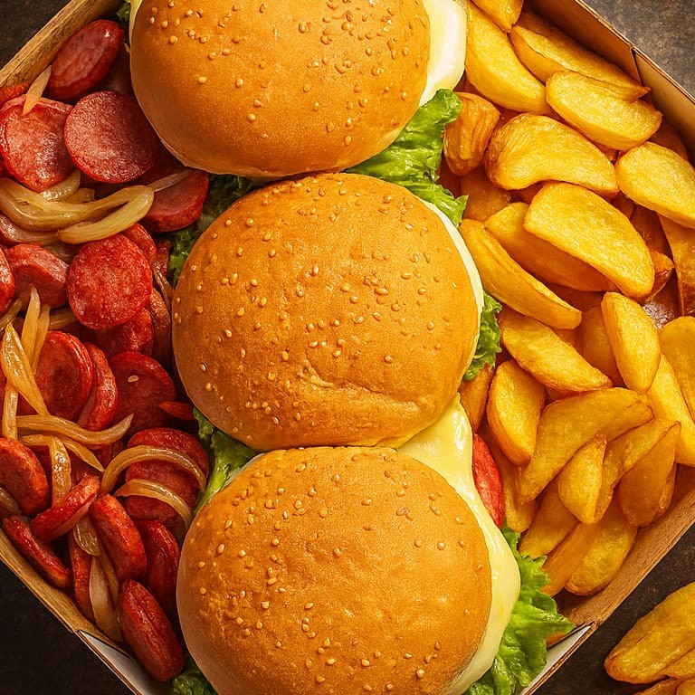 Trio 5 ( 3 saladas burguer + Batata Rustica + calabresa acebolada) 3 salada burguer Pão, hamburguer tradicional de 60 gramas, queijo, salada e molho aproximadamente 300 gramas de batata Rustica e 250 a 300 gramas decalabresa A batata rustica tem um corte mais grosso e rustico, é normal ela aparentar uma textura mais cozida, como se estivesse murcha.