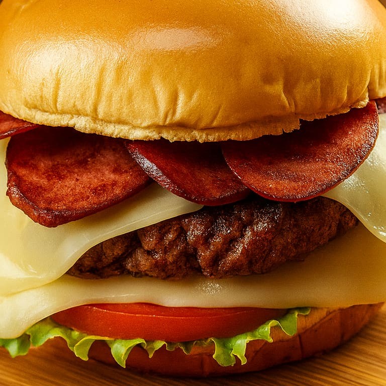 Pão, Hambúrguer Tradicional , queijo, presunto,2 vinas, Maionese, alface e tomate.