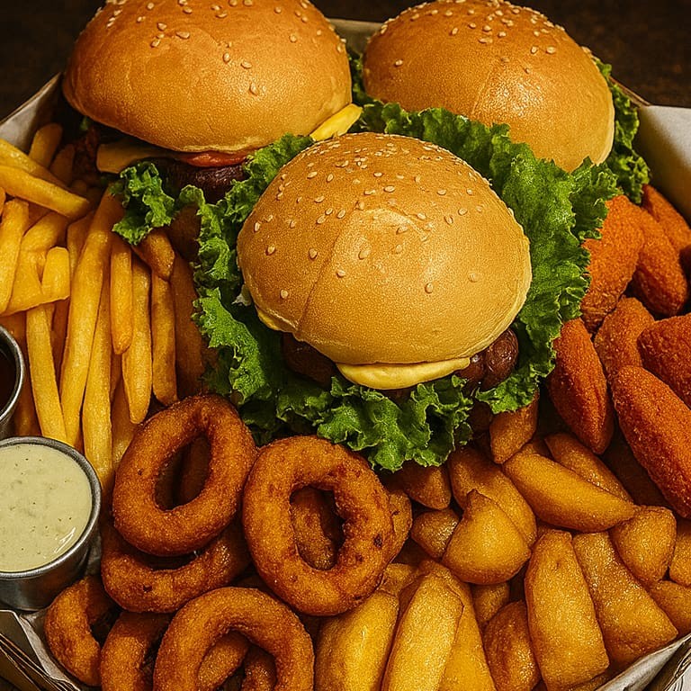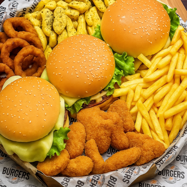 Combo Quinteto Fantastico Três lanches Tradicional a sua escolha (pão macio, hambúrguer tradicional suculento, queijo derretido, alface crocante, tomate fresco e molho Billy Jack especial). Acompanha: 200g de nuggets crocantes 200g de batata frita dourada 200g de onion rings crocantes 200g de batata rústica temperada Tudo servido em uma caixa de pizza de 30 cm, perfeita para compartilhar e impressionar! Quantidade limitada! Peça agora e garanta essa explosão de sabores antes que acabe!