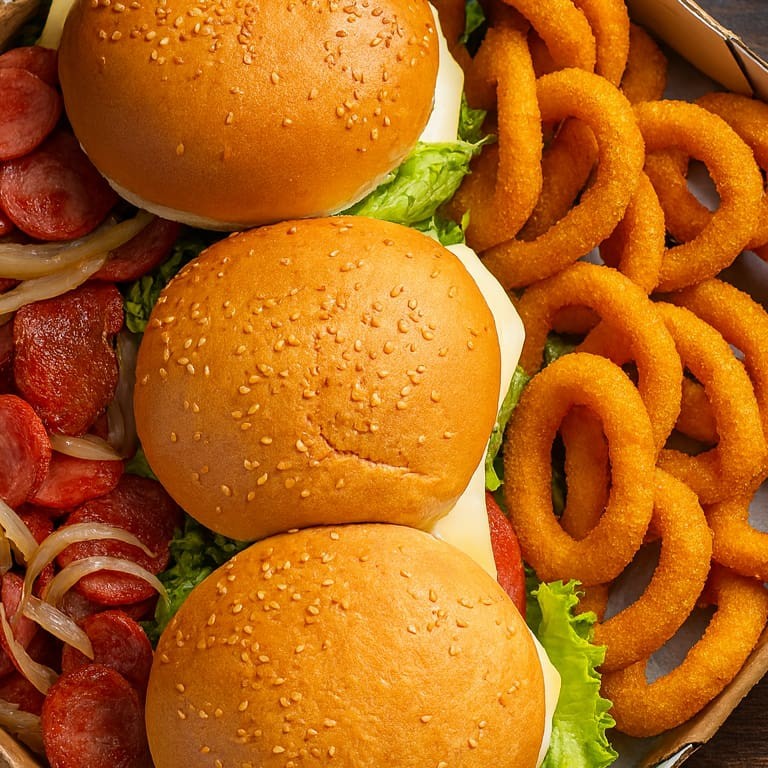 Combo Trio 3: Variedade de Sabores! Experimente uma explosão de sabores com o nosso Combo Trio 3! Este combo inclui: 3 suculentos Salada Burguers, Pão com gergelim selado na manteiga, hamburguer tradicional ,queijo Mussarela, maionese artesanal, alface e tomate. preparados com ingredientes frescos e saborosos para satisfazer seu paladar. Onion Rings crocantes e douradas, adicionando uma textura única e saborosa à sua refeição. Batatas fritas crocantes, o acompanhamento perfeito para completar esta refeição deliciosa. Desfrute desta combinação incrível que oferece uma variedade de sabores em cada mordida! Obs: Devido Ao Transporte A Batata Pode Perder A Crocancia! Combo Recomendado para 3 pessoas Por favor, note que a imagem apresentada é meramente ilustrativa. Todos os combos estão sujeitos a variações na cor, organização e quantidade dos itens.