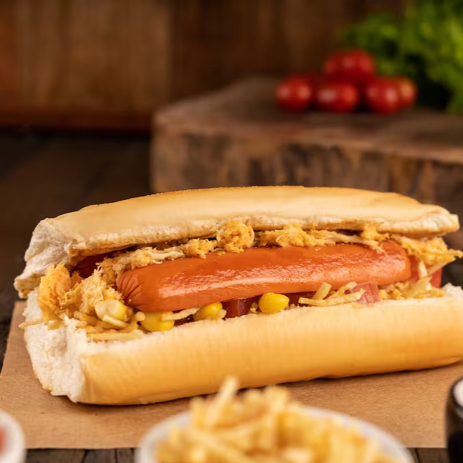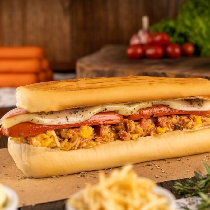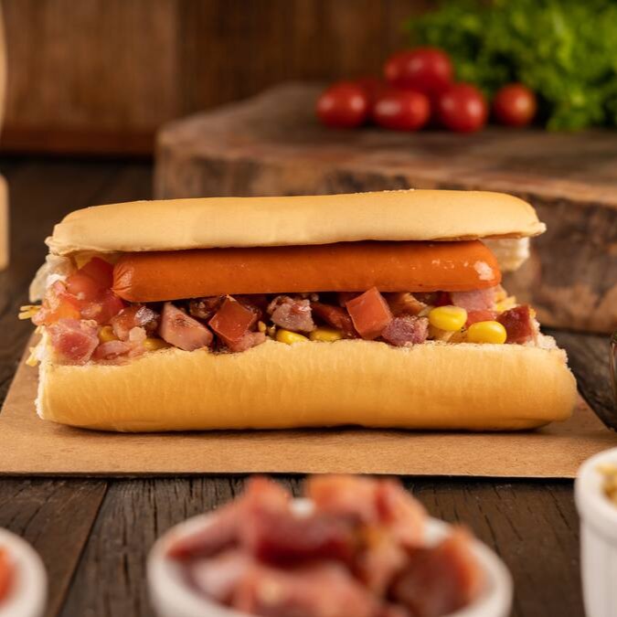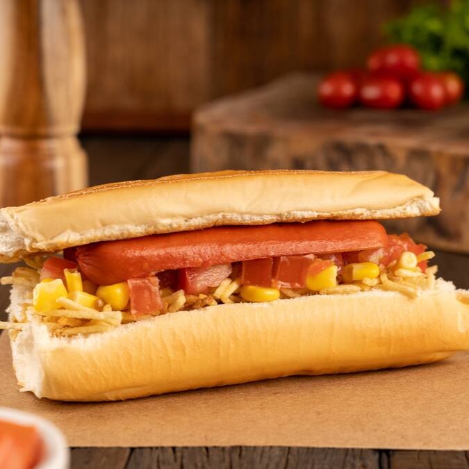 Pão, 2 vinas, tomate, milho, maionese, batata palha, frango, bacon, calabresa