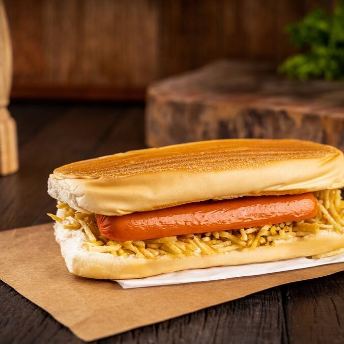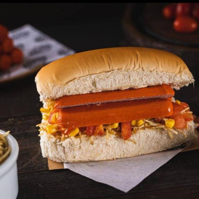 Pão, vina, calabresa, tomate, milho, maionese da casa, batata palha