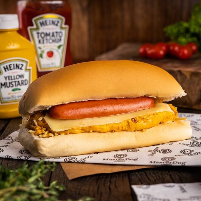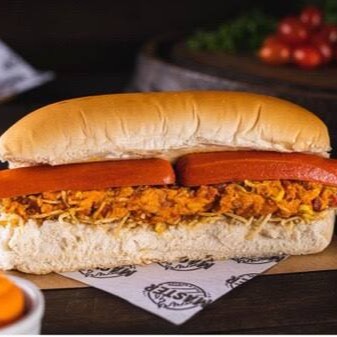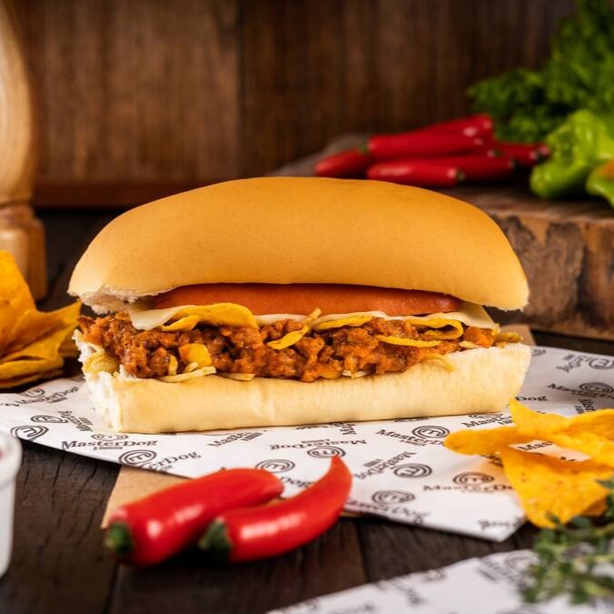 Pão, maionese, batata palha, vina, carne moída levemente apimentada, tomate e milho, queijo, cheddar e Doritos,