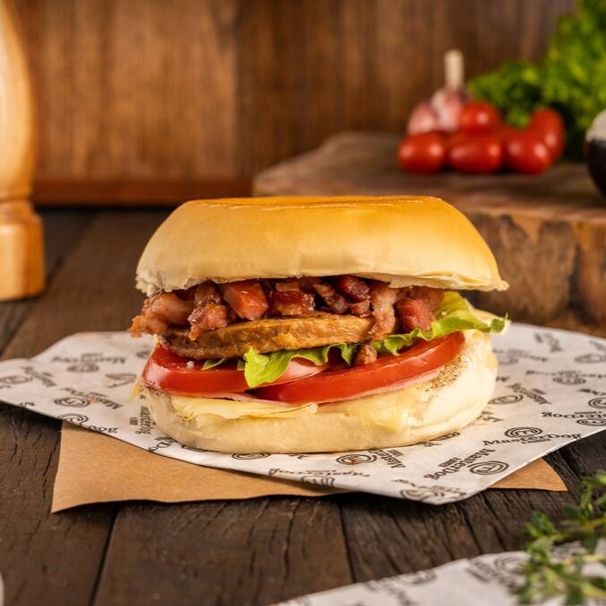 Pão, hambúrguer, bacon, maionese da casa, queijo, presunto, tomate e alface