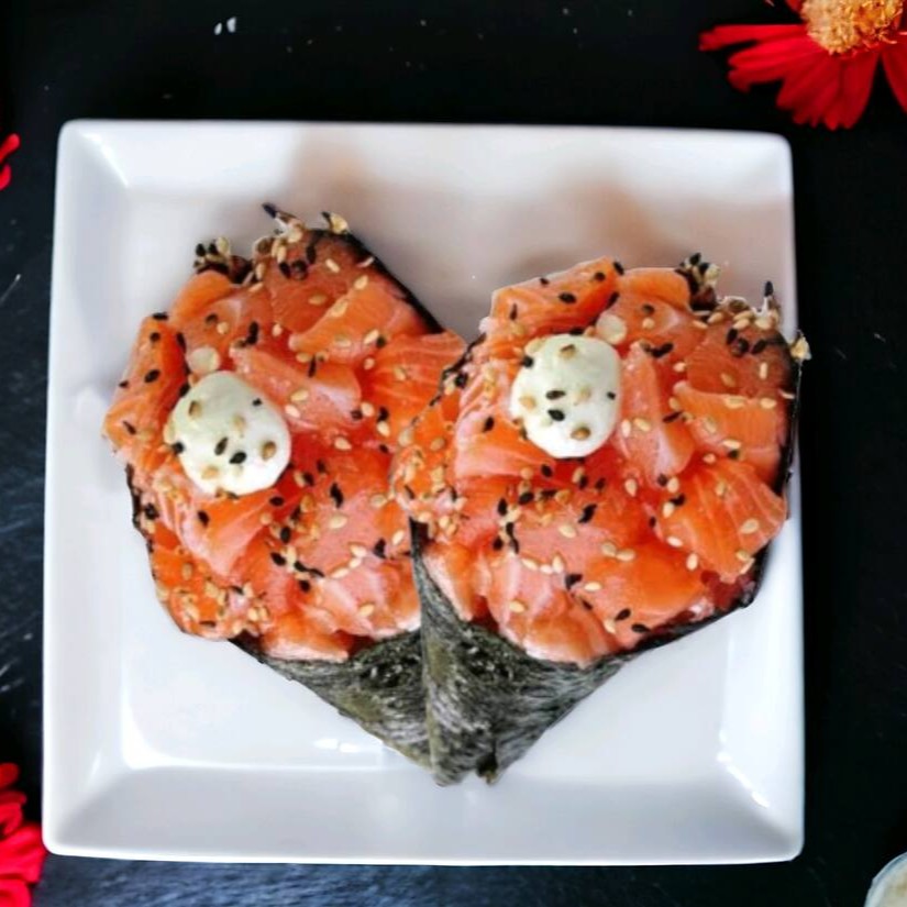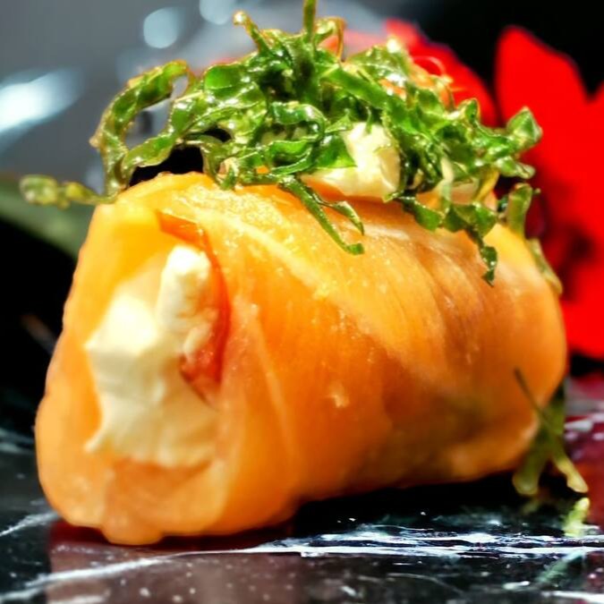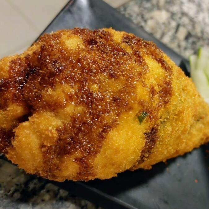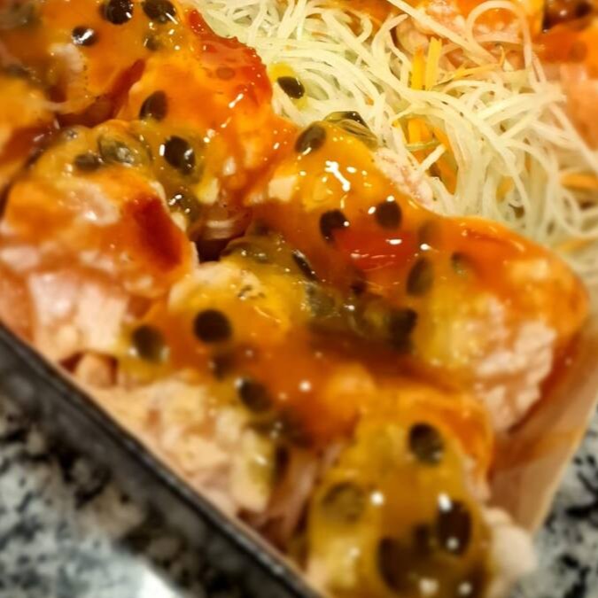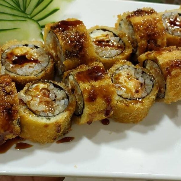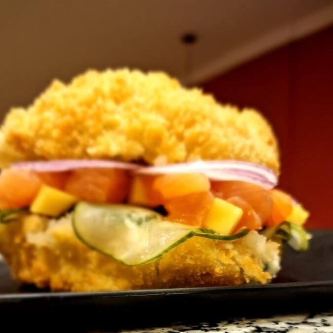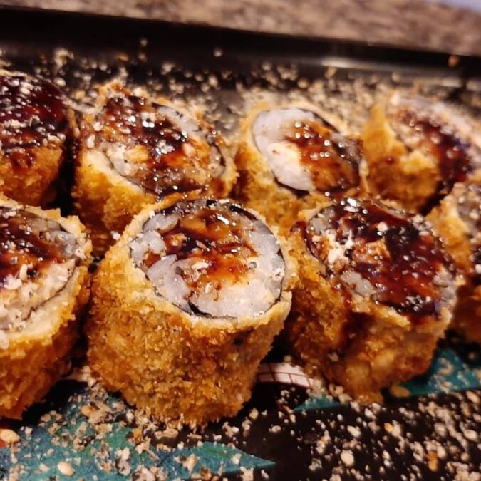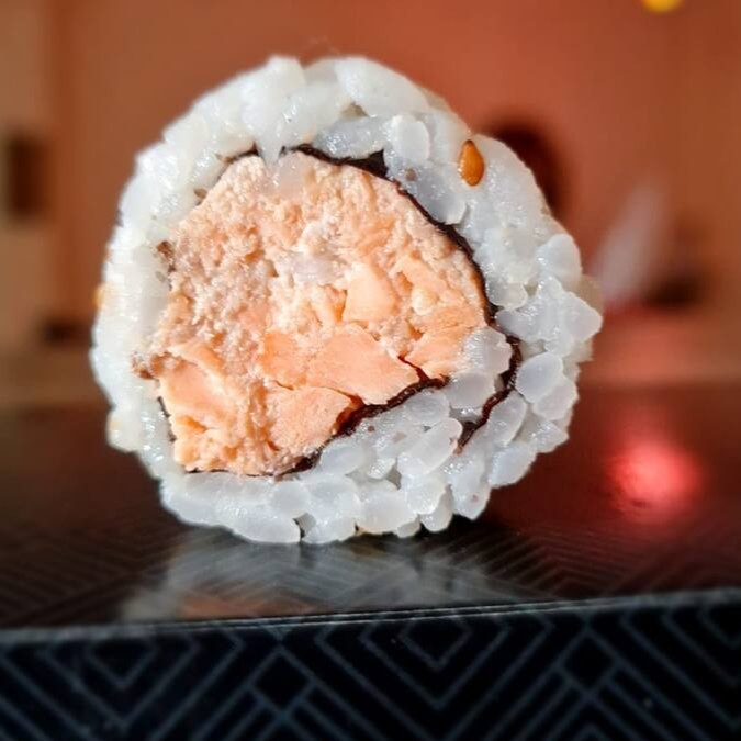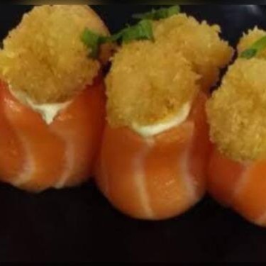 Gohan temperado com cream cheese e cebolinha, empanado em panko, recheado com: salmão, manga, cebola roxa e sunomono.