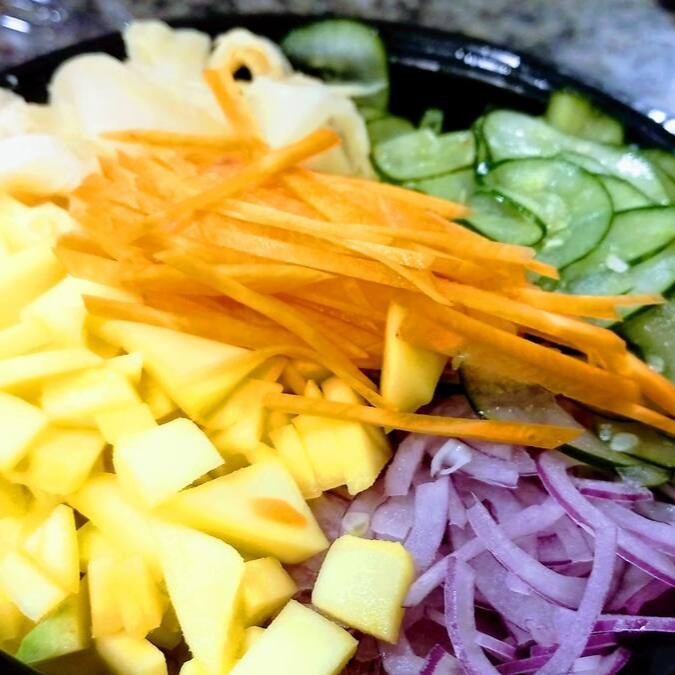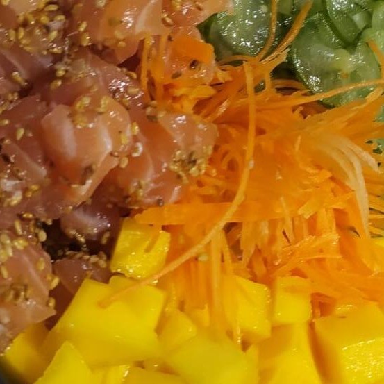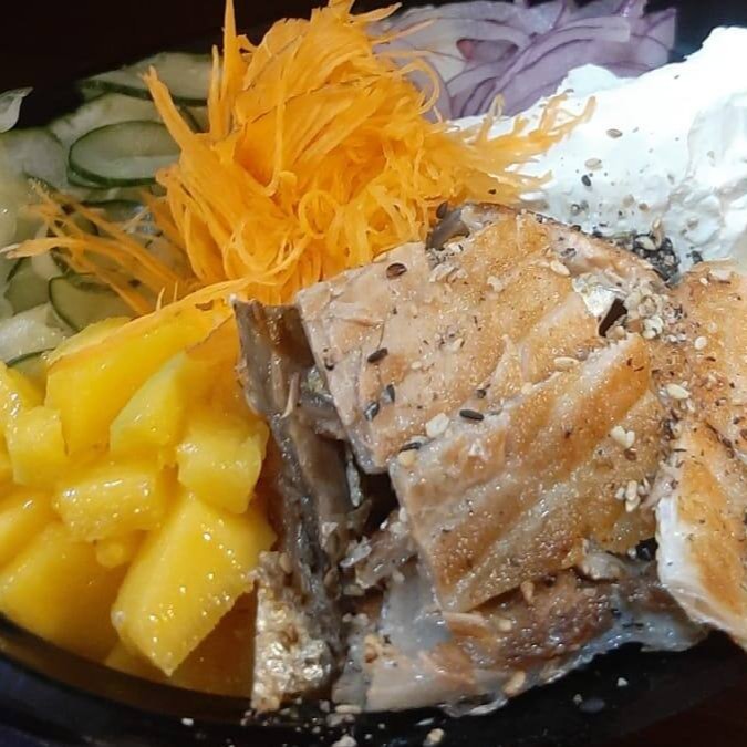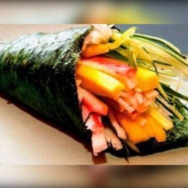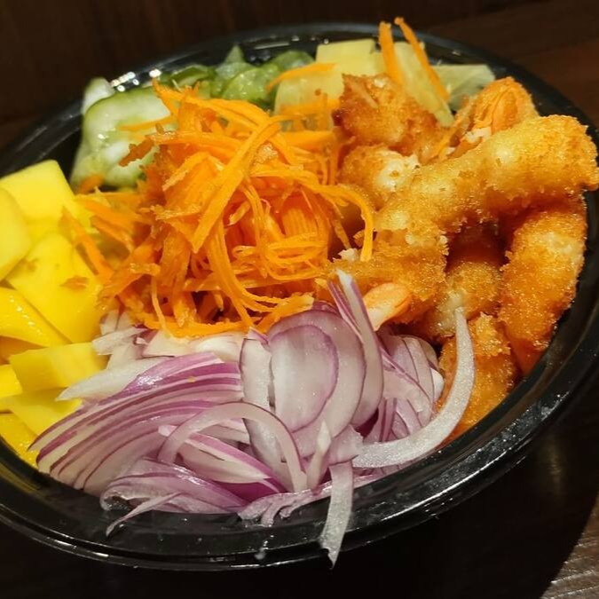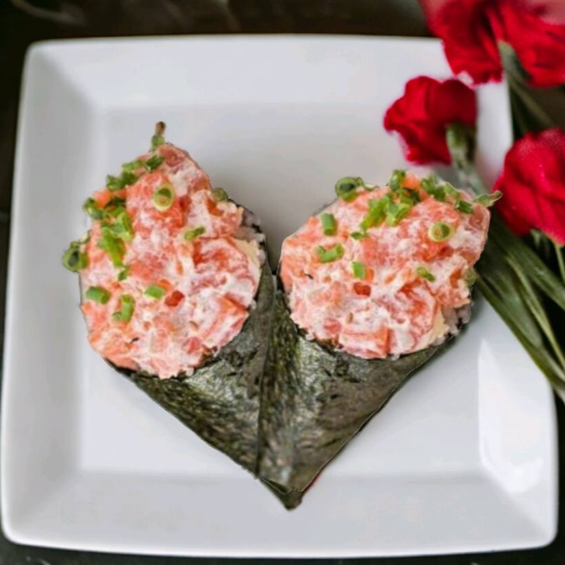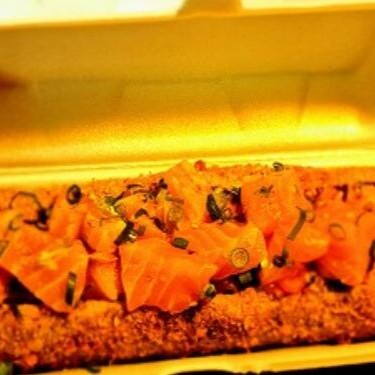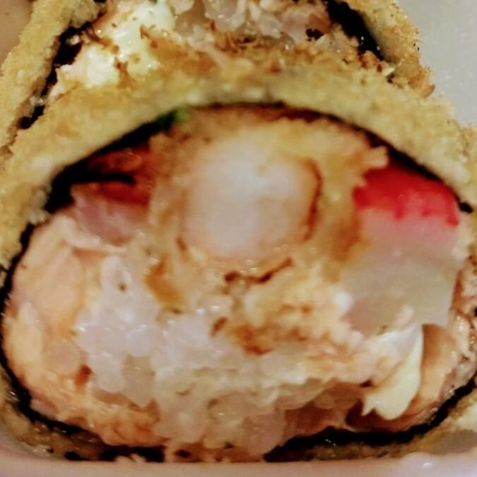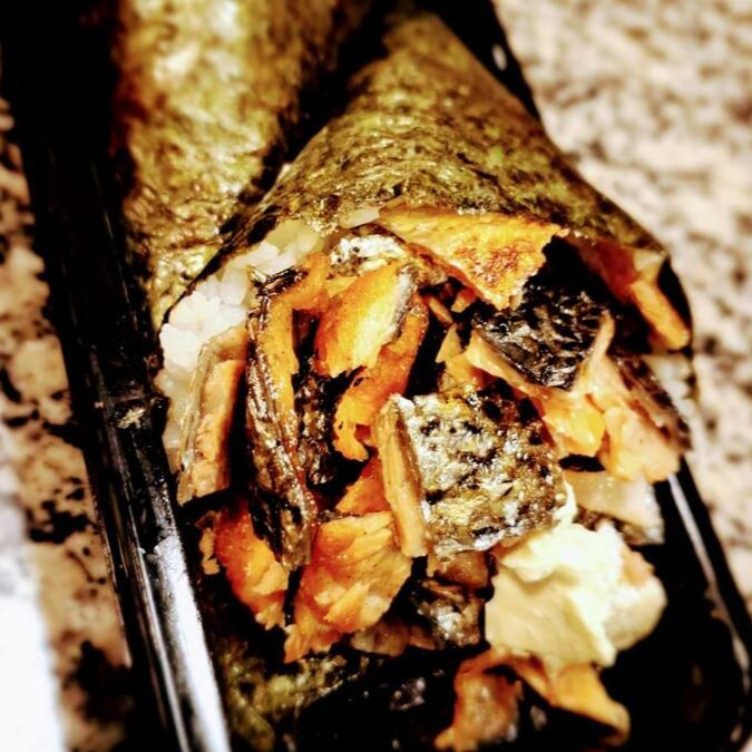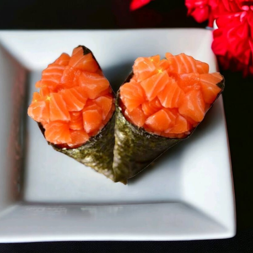 Gohan temperado com cream cheese e cebolinha, empanado em panko, recheado com: salmão, manga, cebola roxa e sunomono.