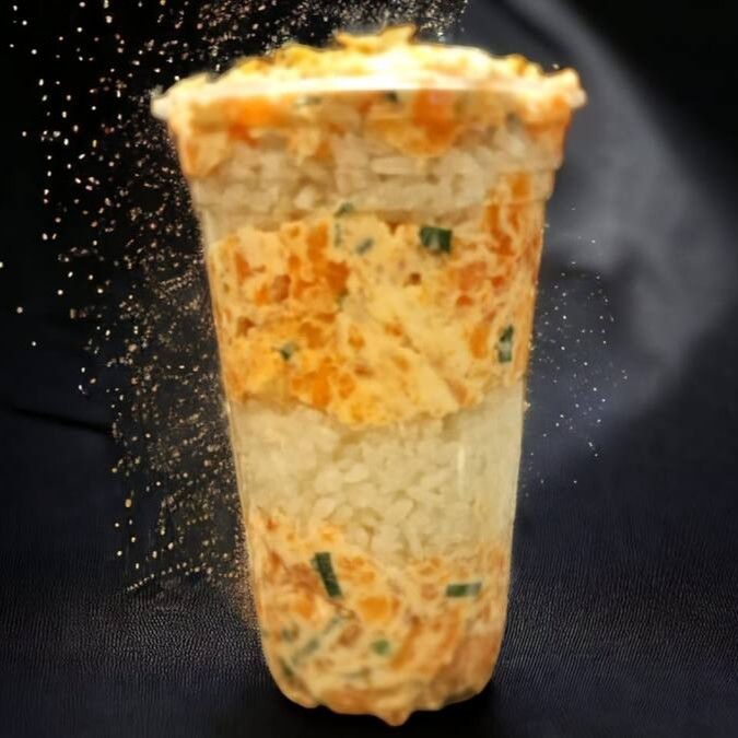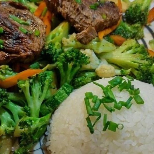 Risoto japonês, abobrinha, cenoura, ovo, camarão, mignon, frango e cebolinha.