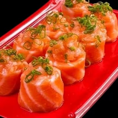 6 sashimi salmão, 6 sashimi salmão selado, 4 uramaki filadelfia, 8 hossomaki salmão, 2 niguiri salmão, 2 niguiri salmão seldado, 4 uramaki niro