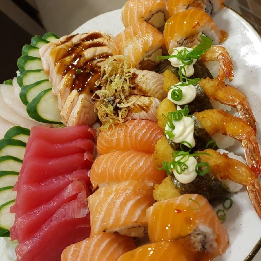 5 Sashimi salmão, 5 Sashimi na crosta, 5 Sashimi tilápia, 8 Uramaki filadelfia, 8 Hossomaki salmão, 2 Niguiri salmão, 2 Niguiri Tilápia, 4 Joe salmão.