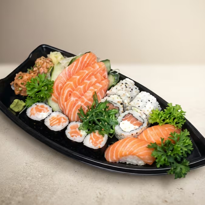 Perfeito para quem quer um mix variado e individual. 5 Sashimi de Salmão, 4 uramaki filadelphia, 2 hossomaki de Salmão, 2 niguiri de Salmão e 2 joe com salmão.