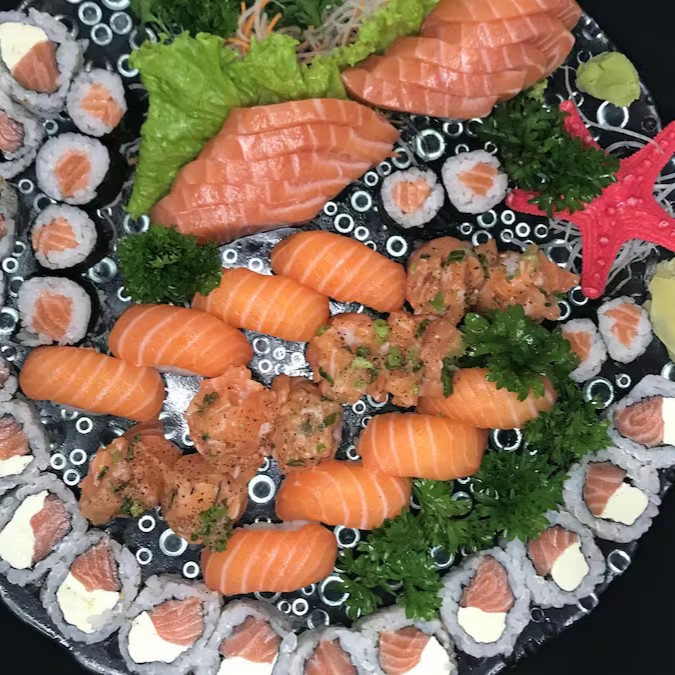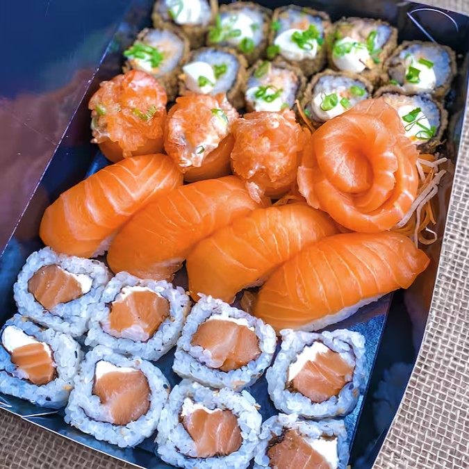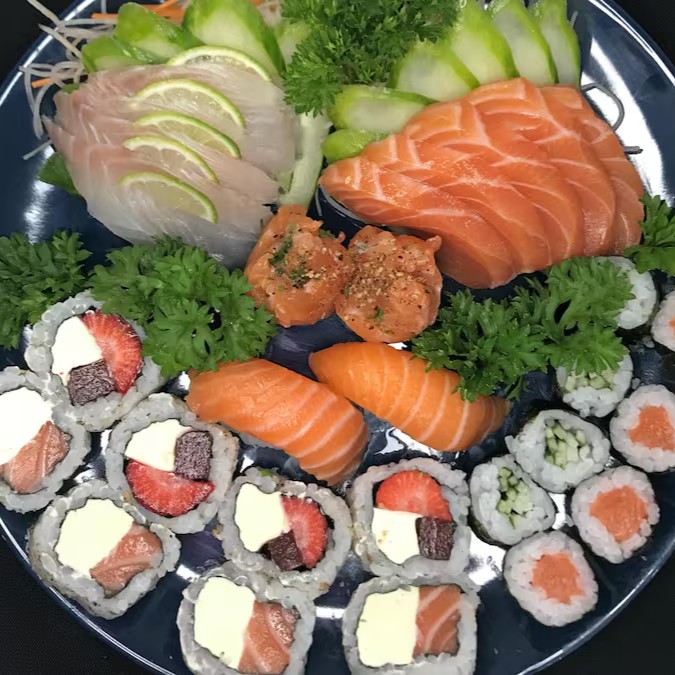 Variedade e frescor de cada peça! Sendo 5 Sashimi de salmão e 5 Sashimi de tilápia, 4 uramaki de Filadelphia, 4 uramaki de Romeu e Julieta, 4 hossomaki de Salmão, 4 hossomaki de pepino, 2 niguiri de salmão e 2 joe.