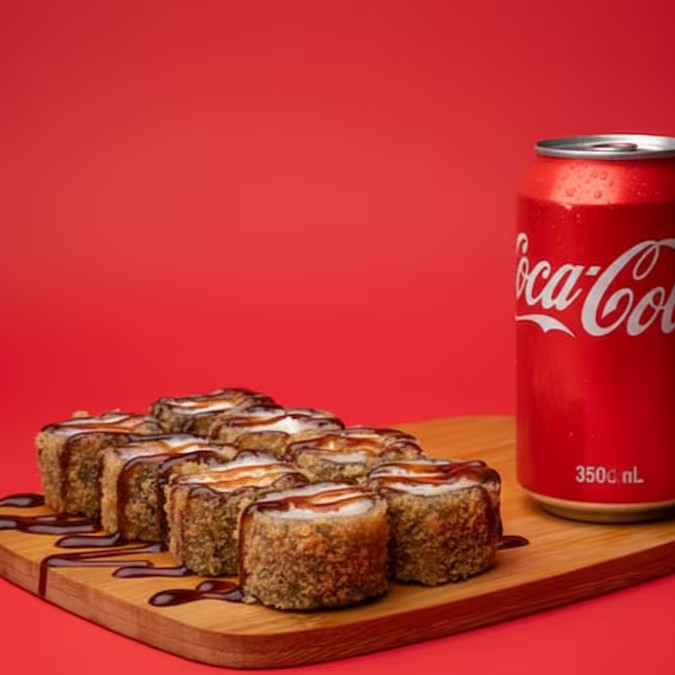 Crocante e Enrolado com arroz, salmão e cream cheese, finalizado com molho tarê e gergelim. O queridinho do sushi quente Acompanhada de Coca Cola 350ml Geladinha !