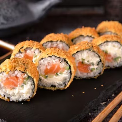 Salmão empanado e crocante com arroz, cream cheese e molho tarê. Uma explosão de sabor em cada mordida!