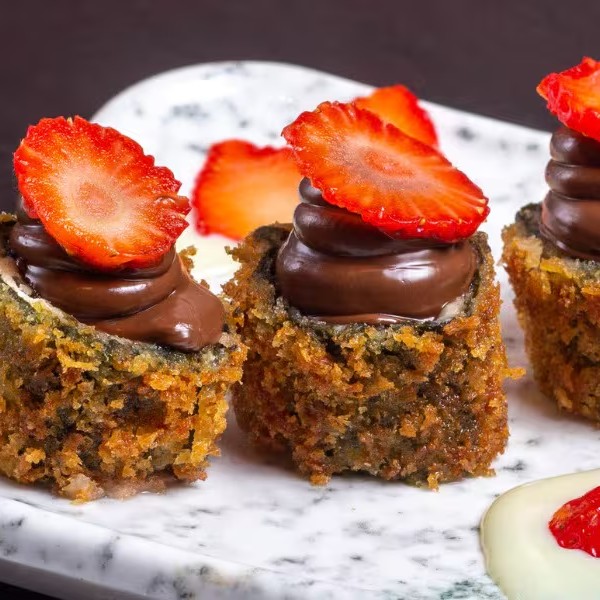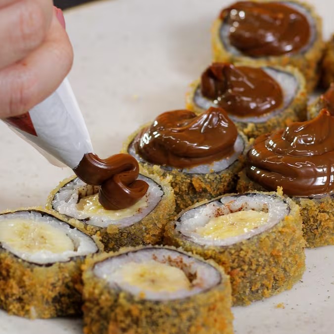 Banana quente e cremosa com cream cheese e doce de leite, envolta por uma casquinha crocante e toque de gergelim.