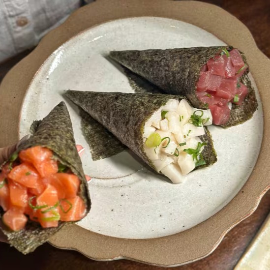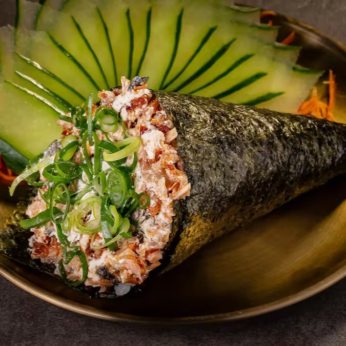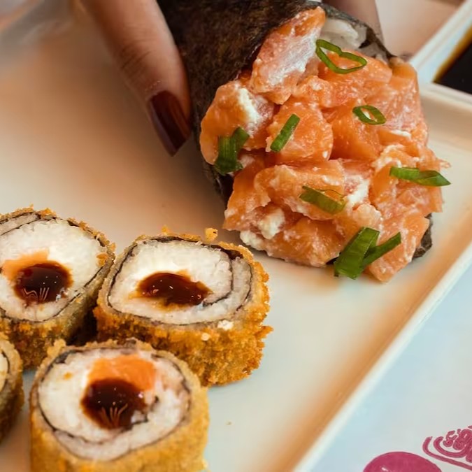 Famoso Temaki Recheado de Arroz Japones, salmão, cream cheese e gergelim e o Clássico Hot Roll Crocante Recheado de Salmão e Cream Cheese.