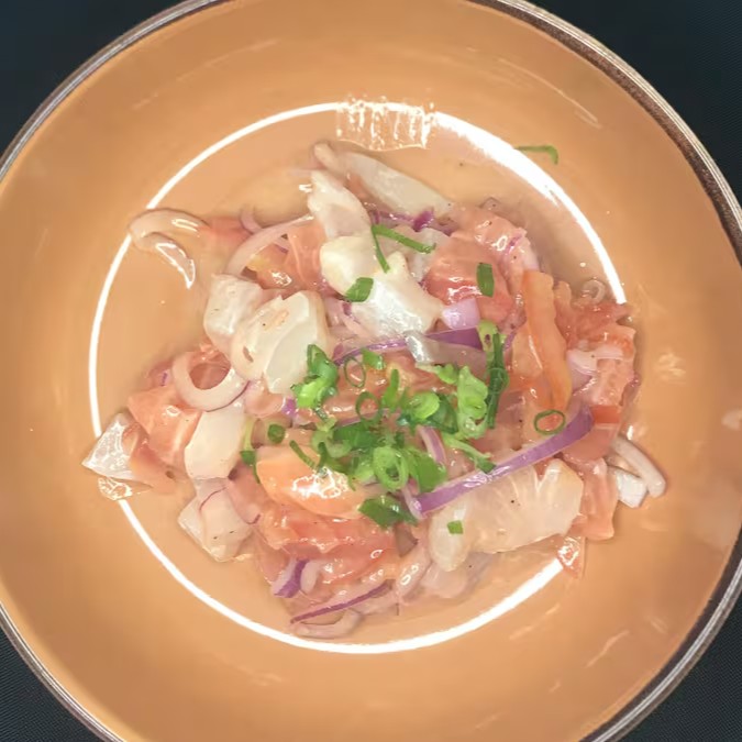 Pedaços de Salmão e Tilapia Fresca com Molho Especial de Ceviche.