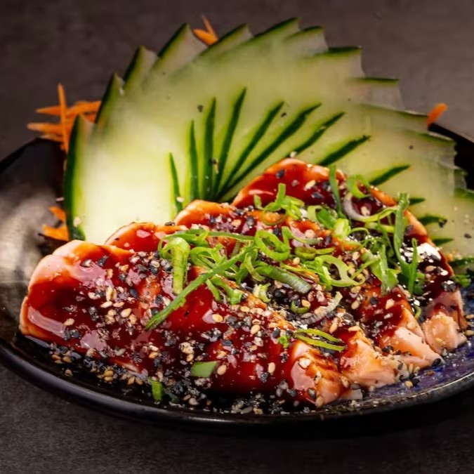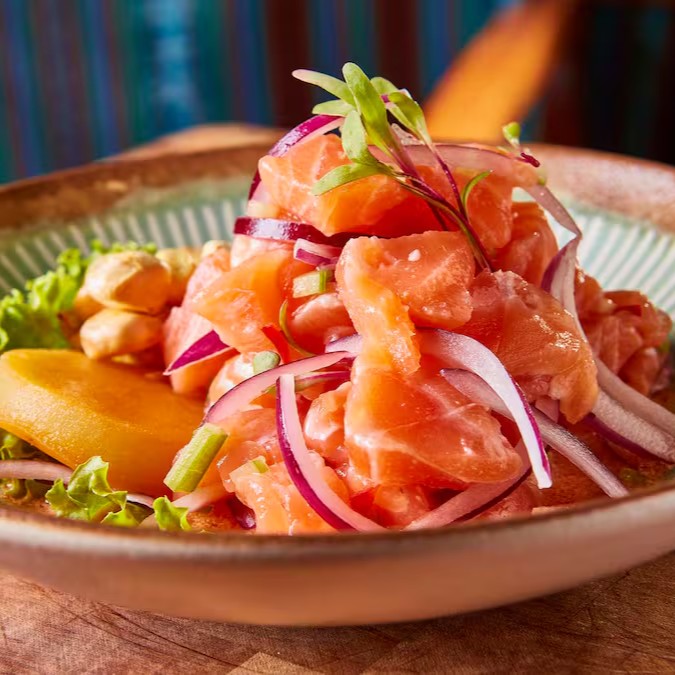 Pedaços de Salmão Fresco com Molho Especial de Ceviche.
