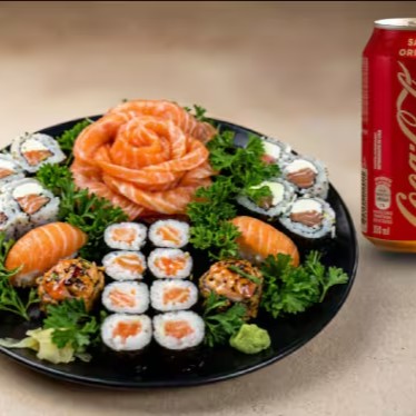 O clássico dos amantes de salmão! 8 uramaki Filadélfia, 4 hossomaki, 4 niguiri e 2 joe de salmão fresquinho Acompanhado de Coca Cola 350ml Geladinha !!