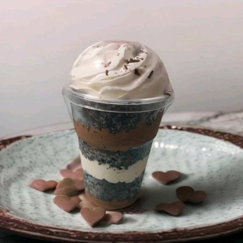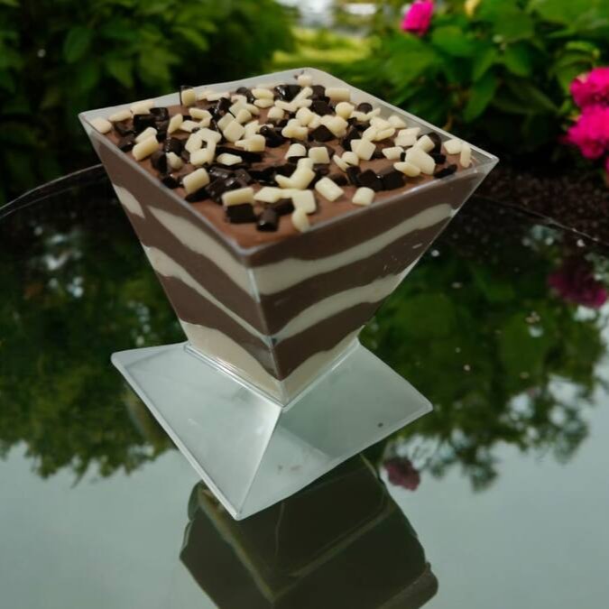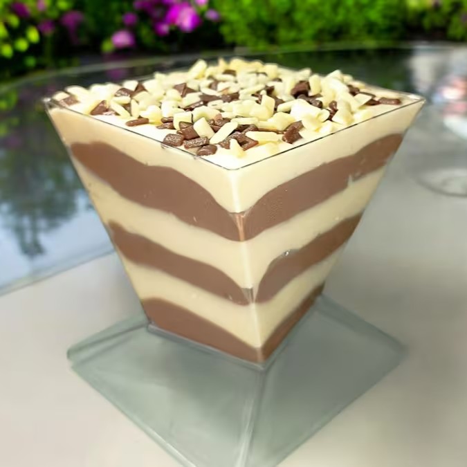 Delicioso Mousse de Chocolate Branco intercalado com Mousse de Chocolate ao Leite, Finalizado com Granule de Chocolate Branco e Raspas de Chocolate ao Leite.