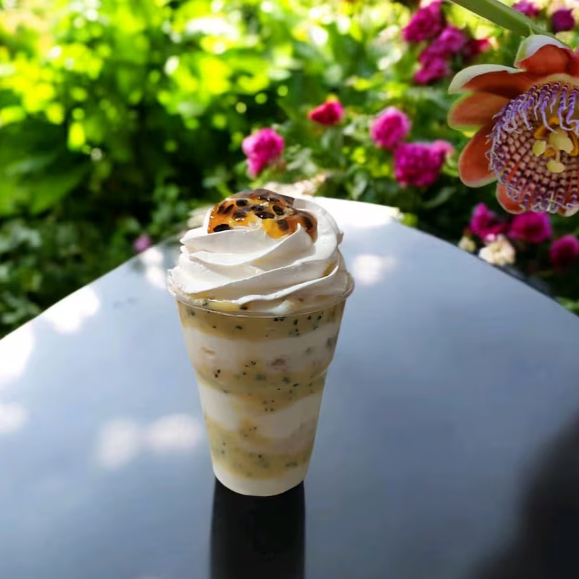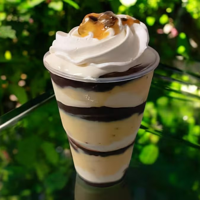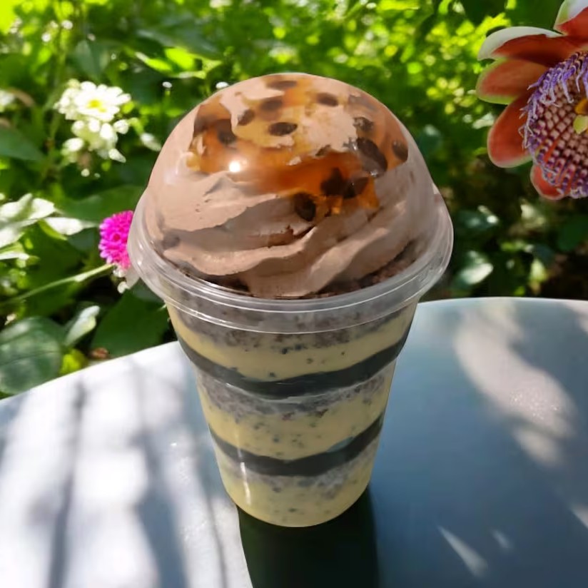 Camadas de Mousse de Maracujá intercaladas com Mousse de Ninho, finalizado com Chantilly Premium e Calda de Maracujá Artesanal