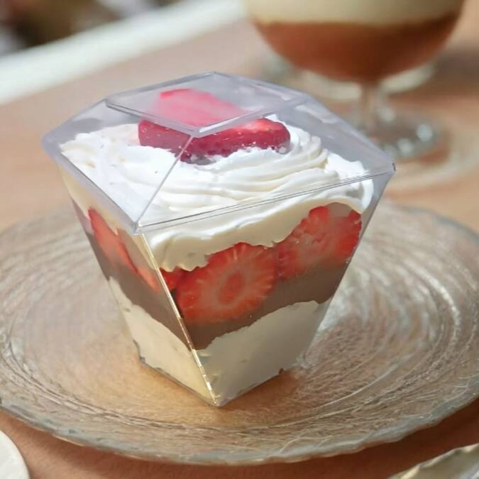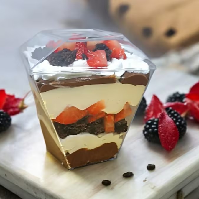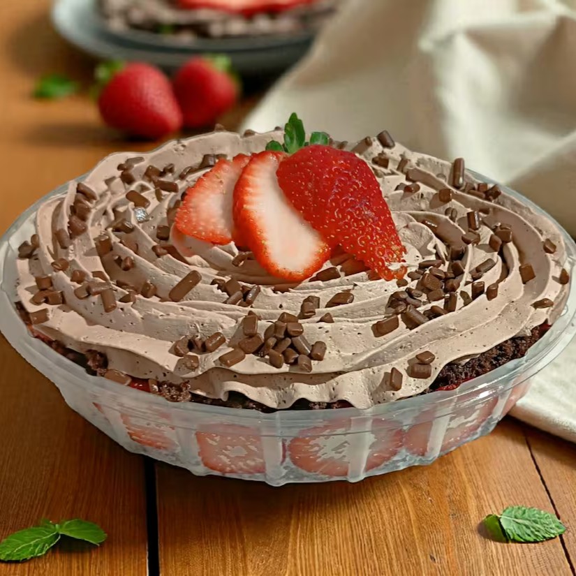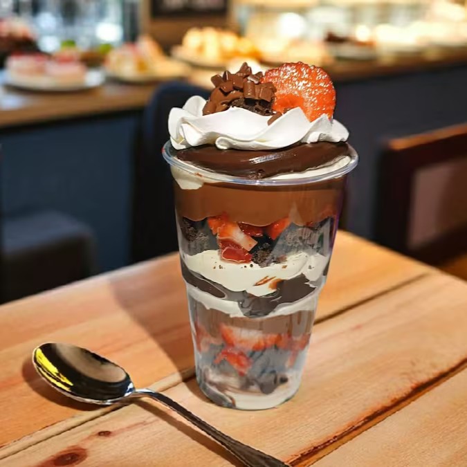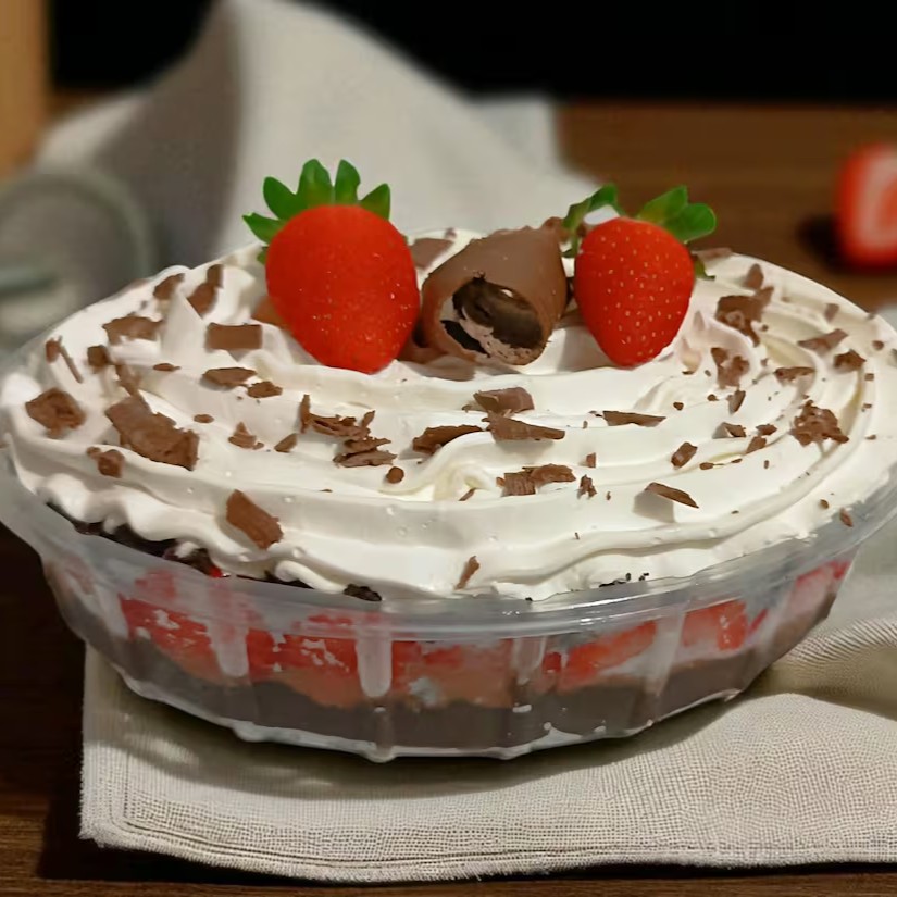 Camada de Brigadeiro seguido de Morango Fresco, mais Brigadeiro, Finalizado com Chantilly Premium de Chocolate, Morango Fresco e Granulle de Chocolate Nobre.