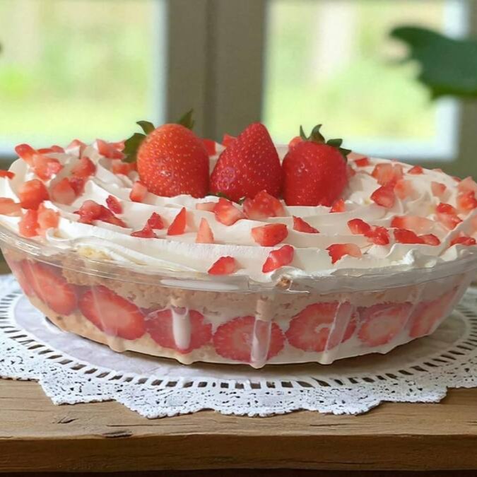 Camada de Mousse de Ninho, Camada de Morango Fresco mais Mousse de Ninho, Finalizado com Chantilly Premium e Morango fresco