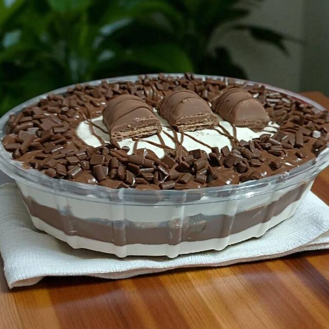 Massa de Chocolate, recheio de Mousse de Ninho com pedaços de Brownie "May Doces", finalizado com Chantilly Premium, quadradinho de Brownie, Nutella e Granulle de Chocolate