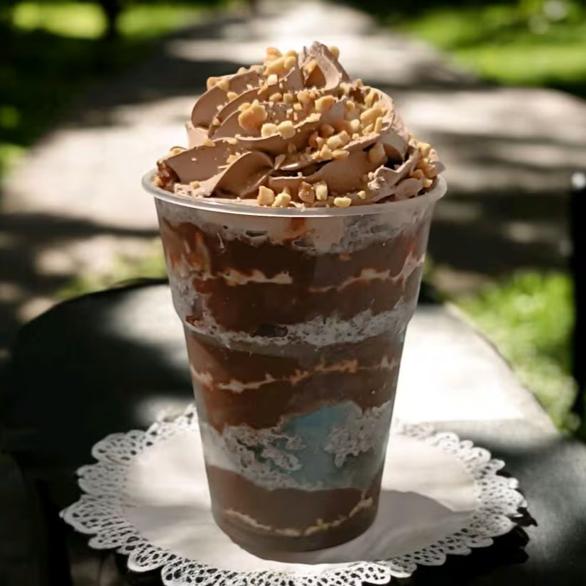 Massa de Chocolate, Recheio de Brigadeiro 50% com Amendoim Granulado, finalizado com Chantilly Premium de Chocolate e Amendoim Granulado
