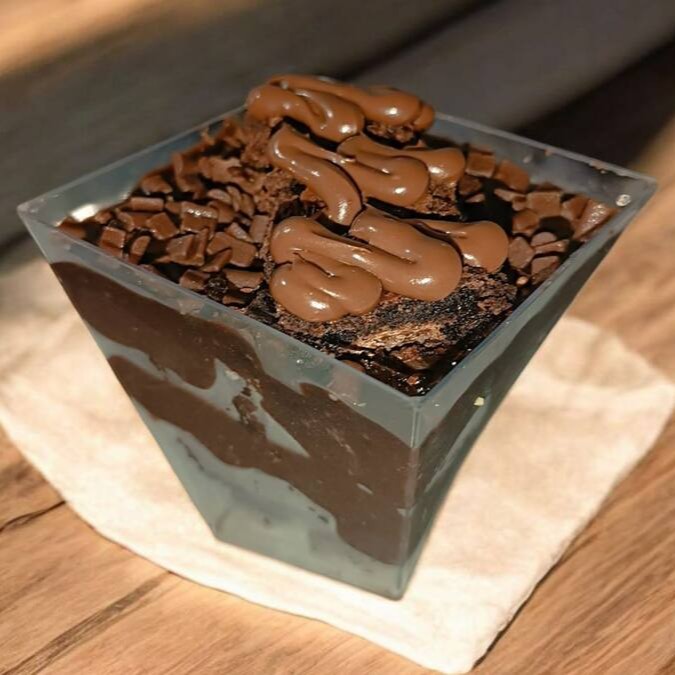 Delicioso Brigadeiro 50%, com pedaços de Brownie, finalizado com Raspas de Chocolate Nobre, Pedaços de Brownie e Nutella.