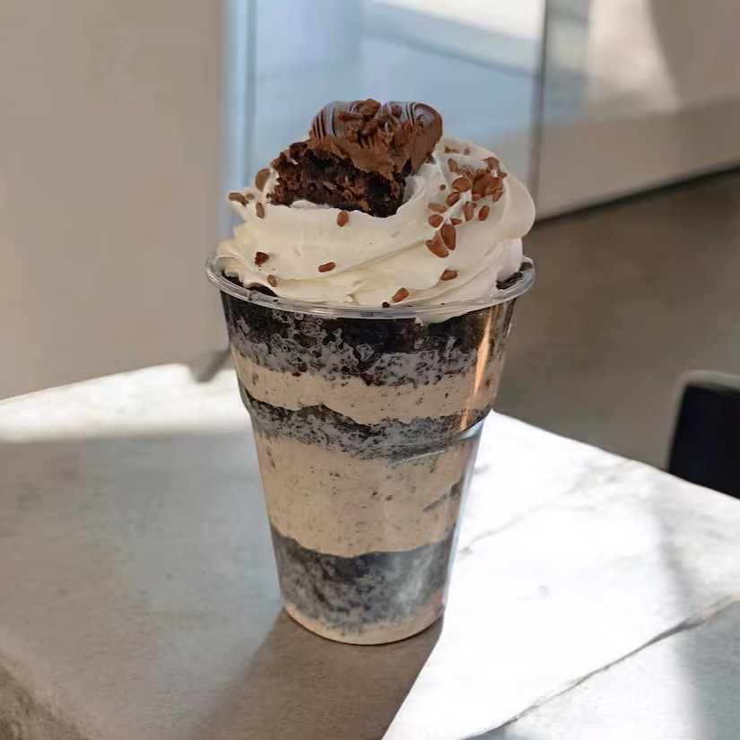 Camadas de Brigadeiro, Mousse de Ninho, Pedaços de Brownie, Morango e Nutella, finalizado com Chantily Premium Tradicional, Brownie, Morango e Nutella.