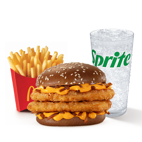 Dois deliciosos hambúrgueres de carne 100% bovina, queijo derretido e irresistíveis fatias de bacon, McFritas média e bebida.