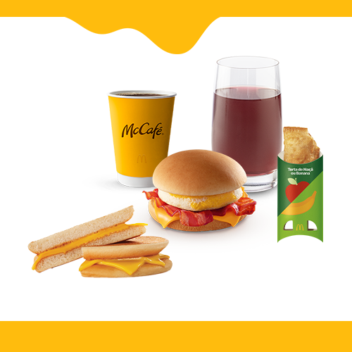 Que Tal Uma Cesta De Mccafé Da Manhã? Nesta composição você leva: 1 Suco Del Valle + 1 Egg Cheese Bacon + 1 Queijo Quente Bacon + 1 Torta + 1 bebida de sua preferência. IMAGEM MERAMENTE ILUSTRATIVA.