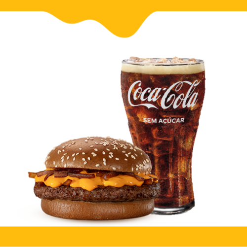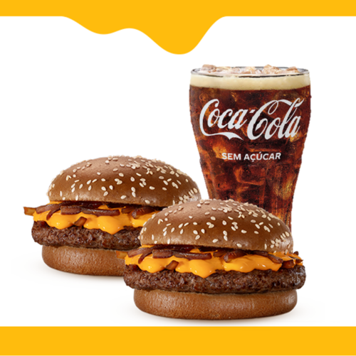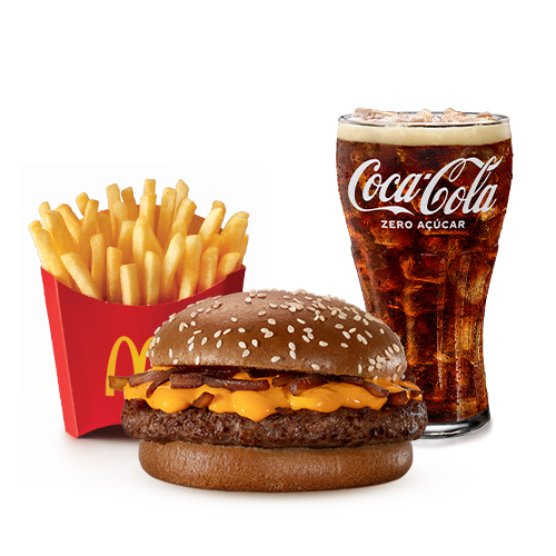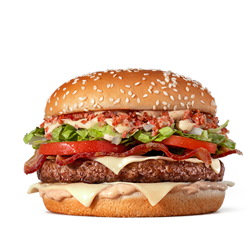 Composto por dois hambúrgueres de carne 100% bovina, o icônico molho tasty, uma combinação especial de bacon crispy e fatias de Bacon, queijo processado sabor emental, tomate, alface, cebola, tudo isso no pão com gergelim, acompanhamento e bebida.