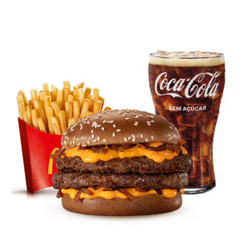 Dois hambúrgueres (100% carne bovina), molho lácteo com queijo tipo cheddar, cebola ao molho shoyu e pão escuro com gergelim, acompanhamento e bebida.