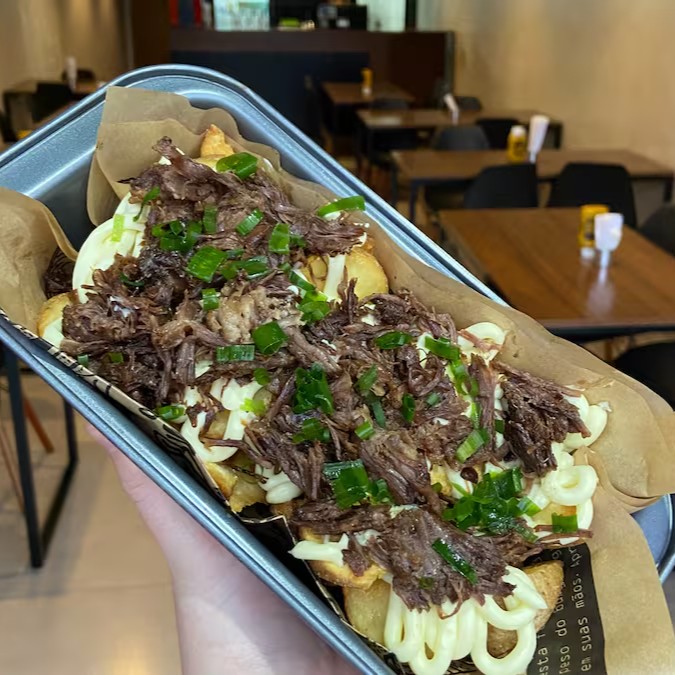 Deliciosa Porção de Batata Palito 400g, com Pernil Suíno desfiado, Cream Cheese e Cebolinha.