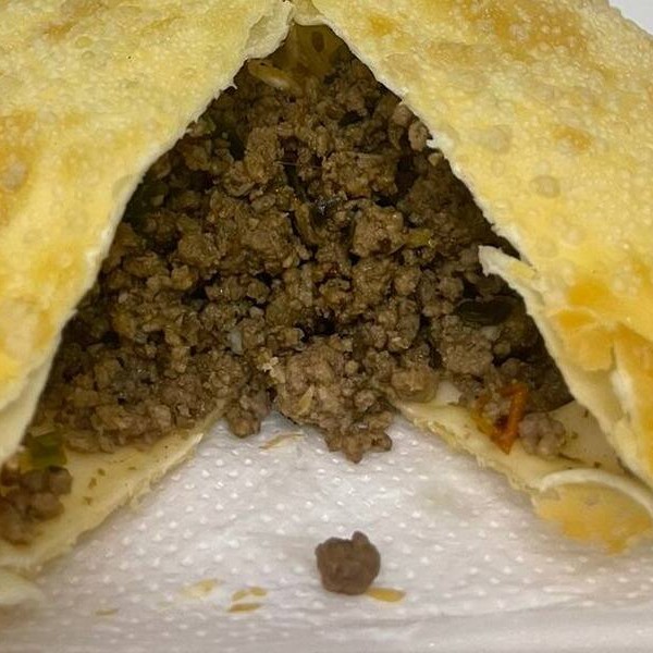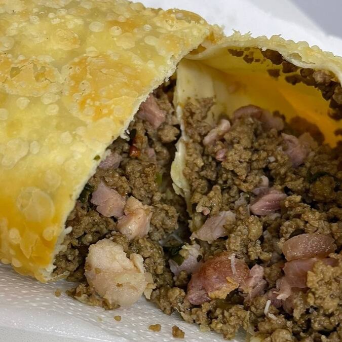Uma combinação irresistível de carne e bacon em cubos, envolta em uma massa crocante e dourada.