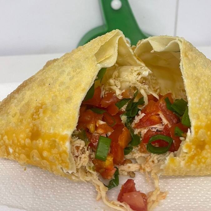 Uma combinação irresistível de frango , cheiro verde e tomate , envolta em uma massa crocante e dourada.