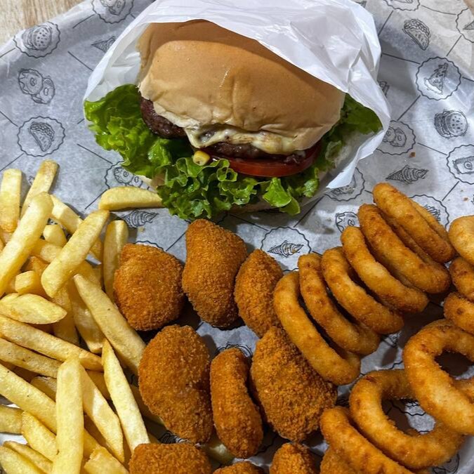 1 X-salada com hambúrguer artesanal + 100g de anéis de cebola + 100g de nuggets de frango + 200g de batata frita + 1 Coca-Cola lata.